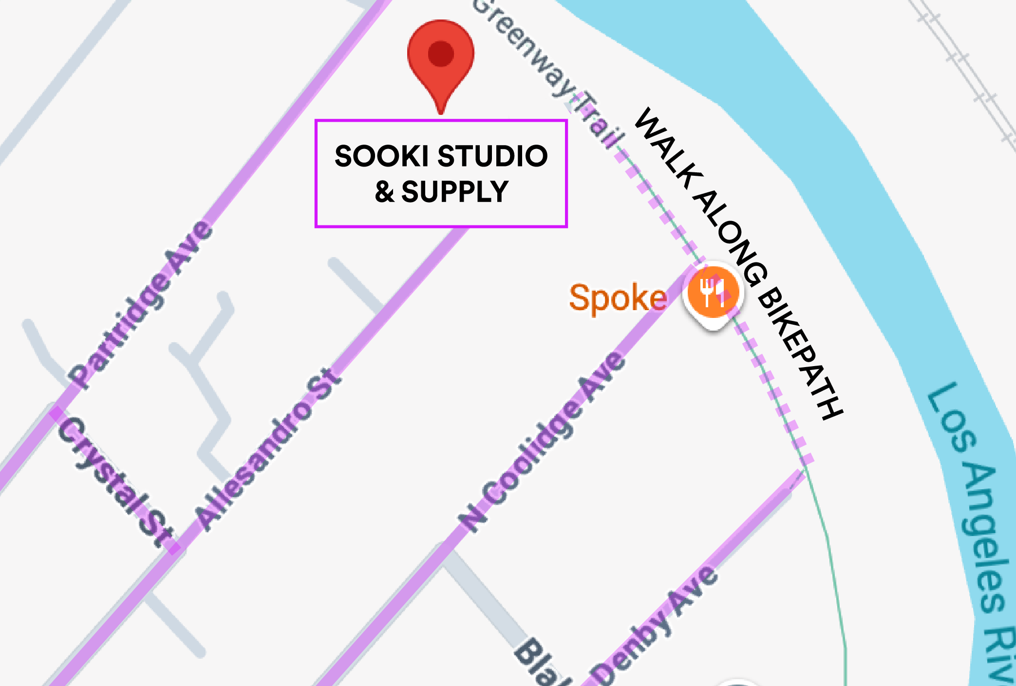 Sooki Studio is located in Frogtown Los Angeles, right off the LA River bike path. You are welcome to purchase our work in person or come and learn about our process. To schedule a studio visit or inquire about commissions please email info@sooki.studio