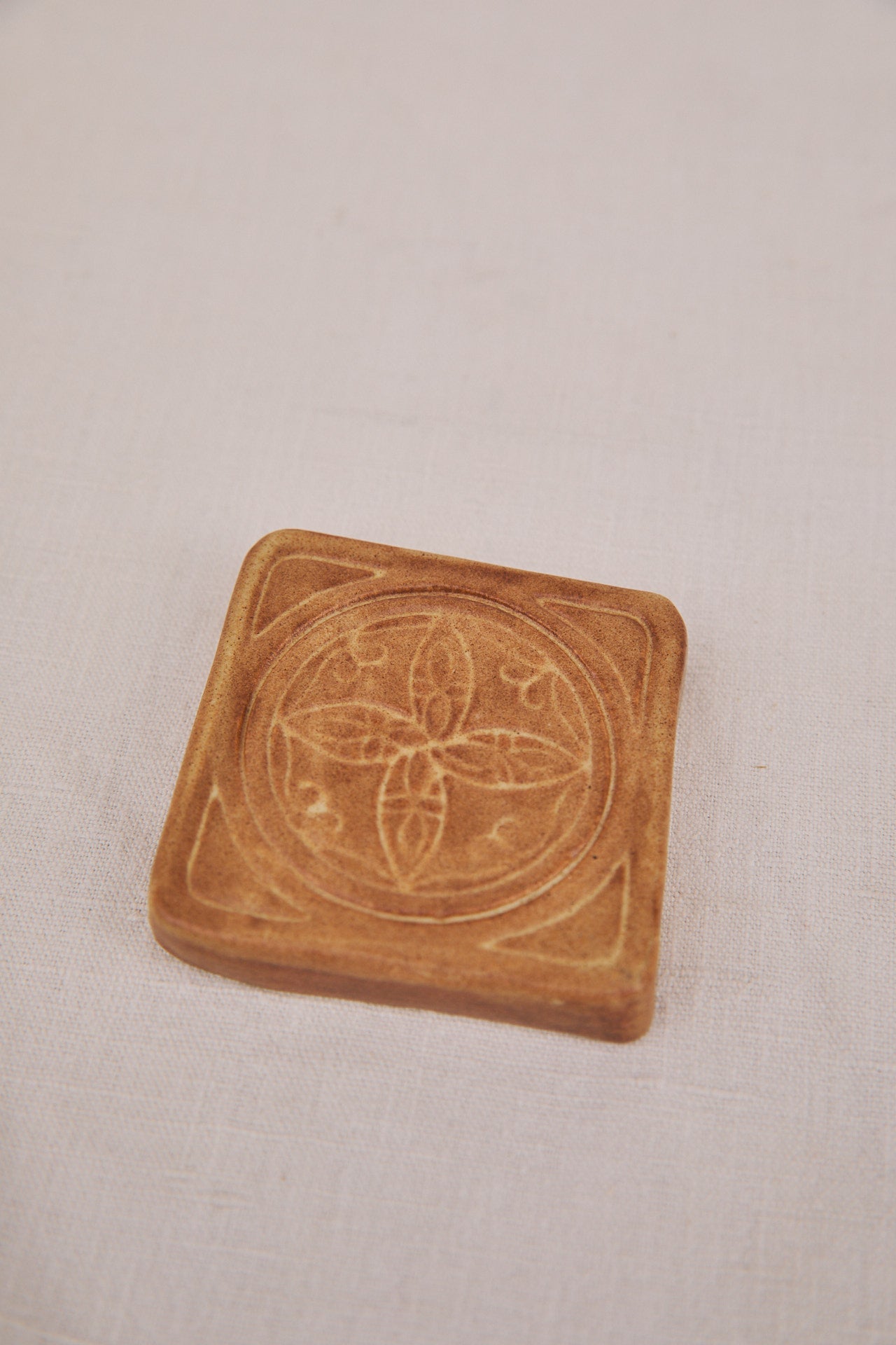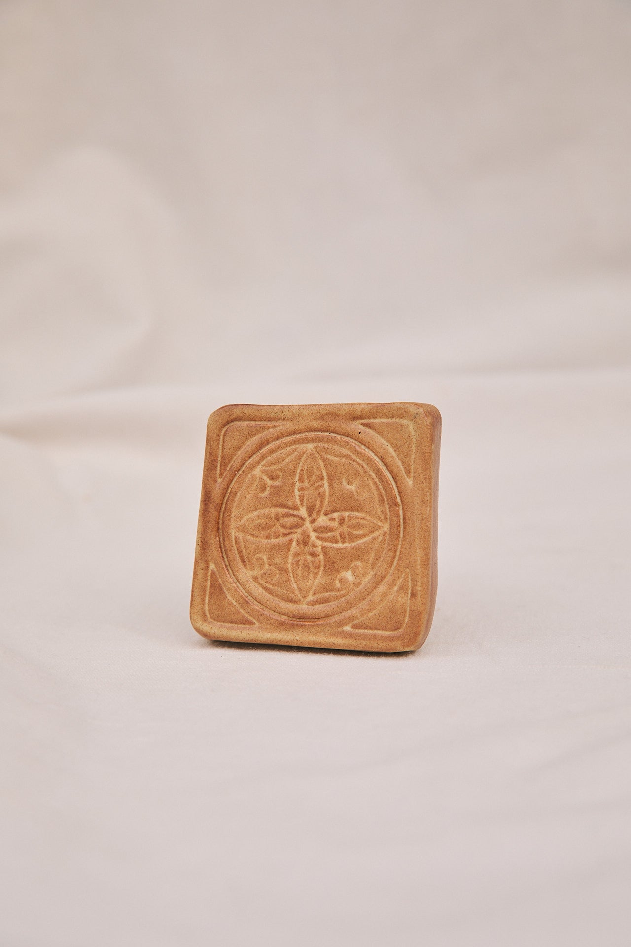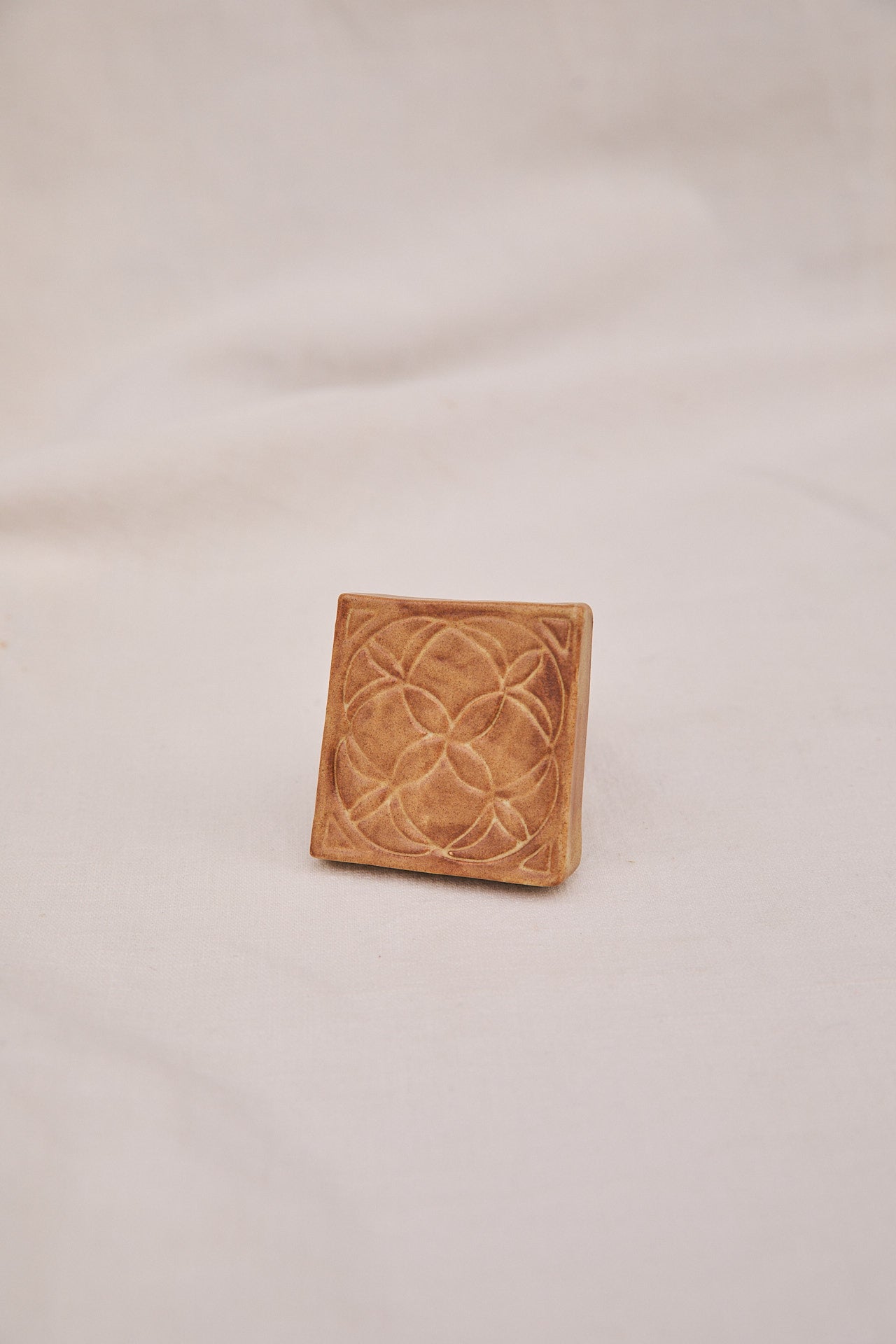 Hand carved ceramic tile, made by Gina A. Sookias, each piece is 2x2". This piece can be wall hung or laid flat.