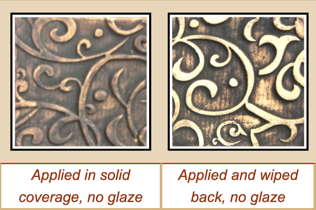 These pigments are meant to be diluted 50:50 and best when applied to cone 04 bisque. Brush over the entire surface and allow to dry. Wipe back with a damp sponge leaving your desired amount on the surface and in crevices. You can glaze select areas, or choose an all-over glaze technique. These pigments can be fired from cone 06 all the way up to cone 10!