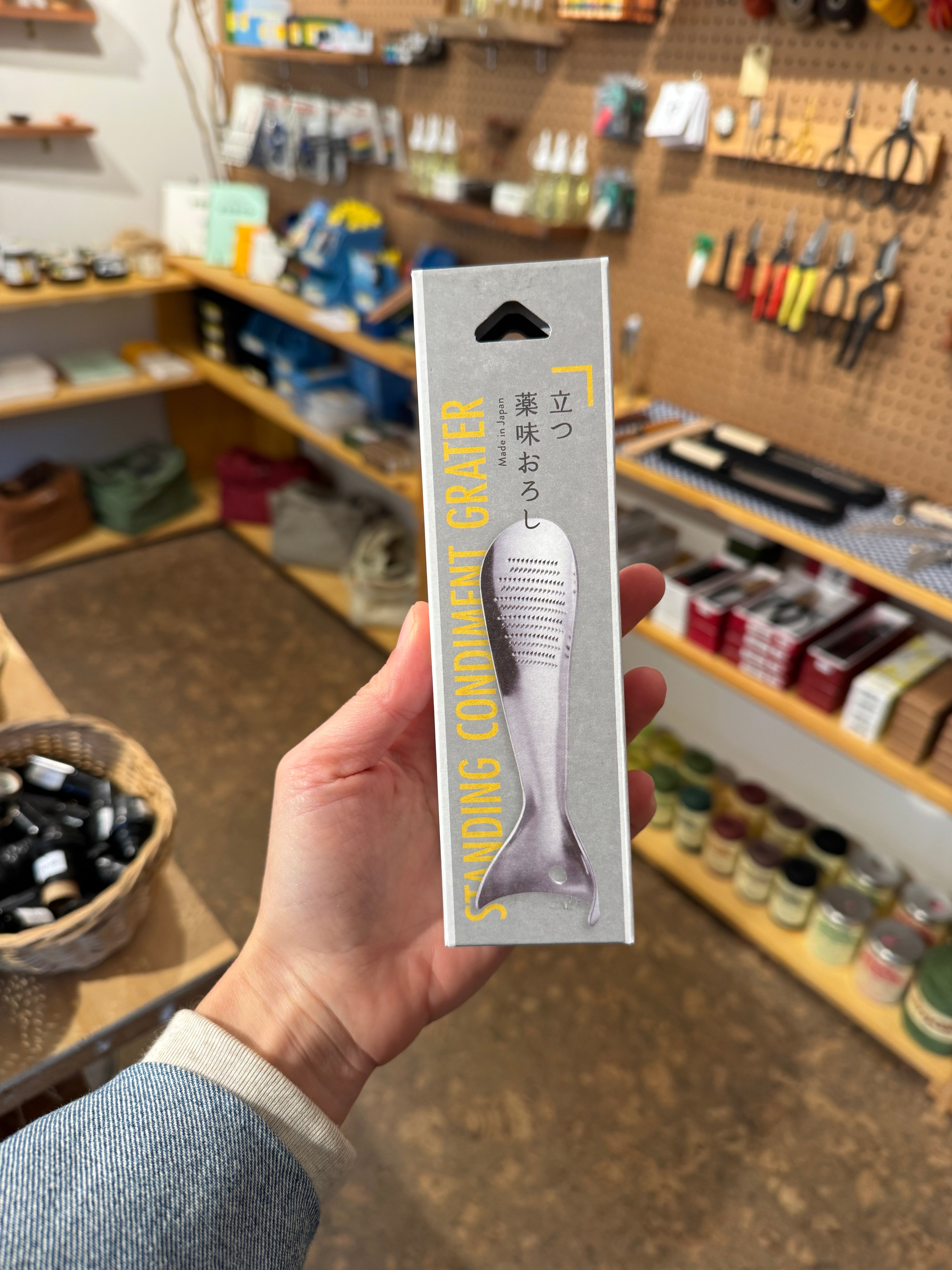 Lovely little Japanese Oroshi grater for wasabi (horseradish) daikon (radish) ginger, nutmeg etc. It turns food to to a fine paste rather than actually shredding it and is great for a ginger tea. A friend of Niwaki's reckons it’s the best thing ever for her masala. It stands up, hangs up, looks like a shoe horn, and is just over 6" tall. Brilliant