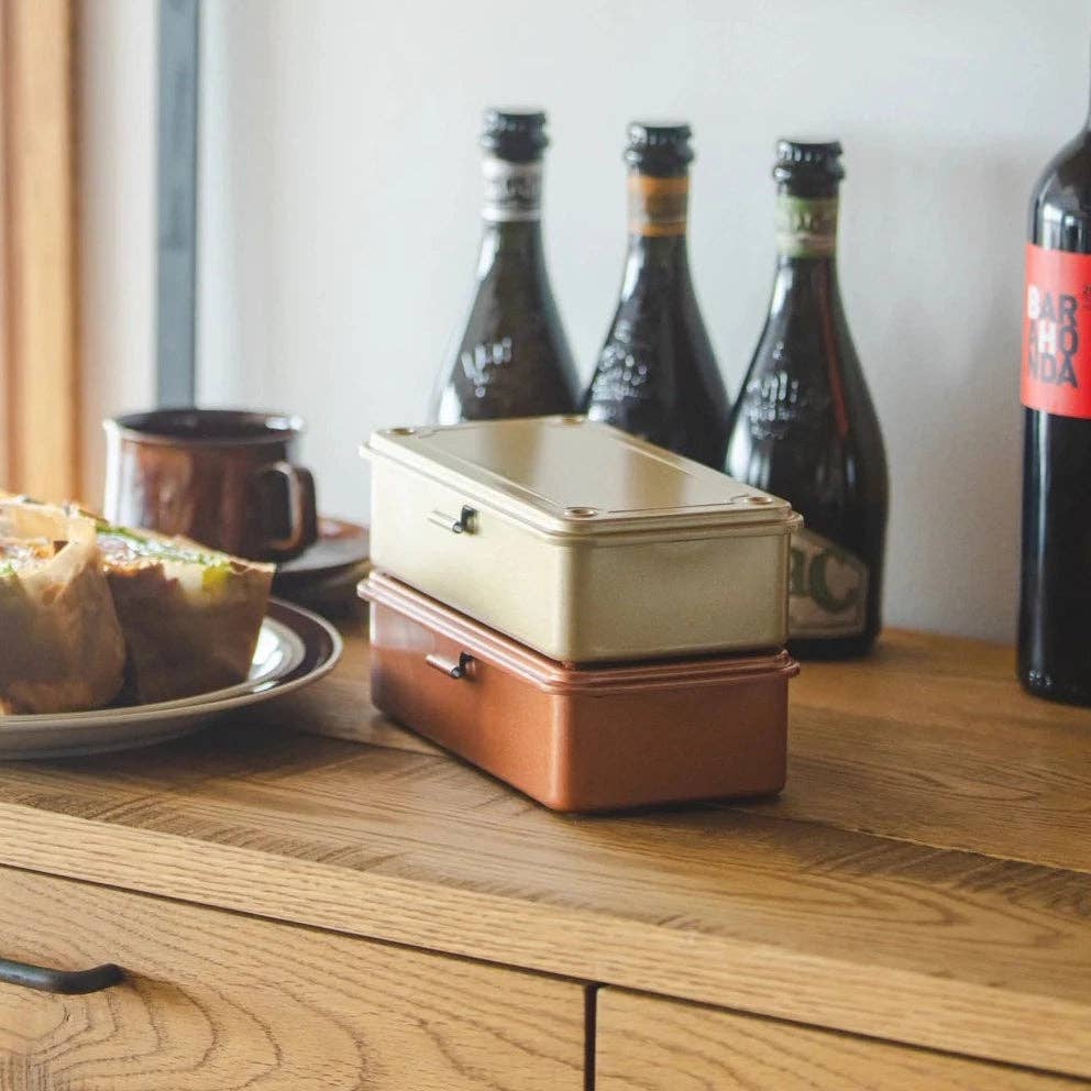 Pressed from a single piece of steel, this sleek storage box features a flat lid and seamless, edge-free construction.