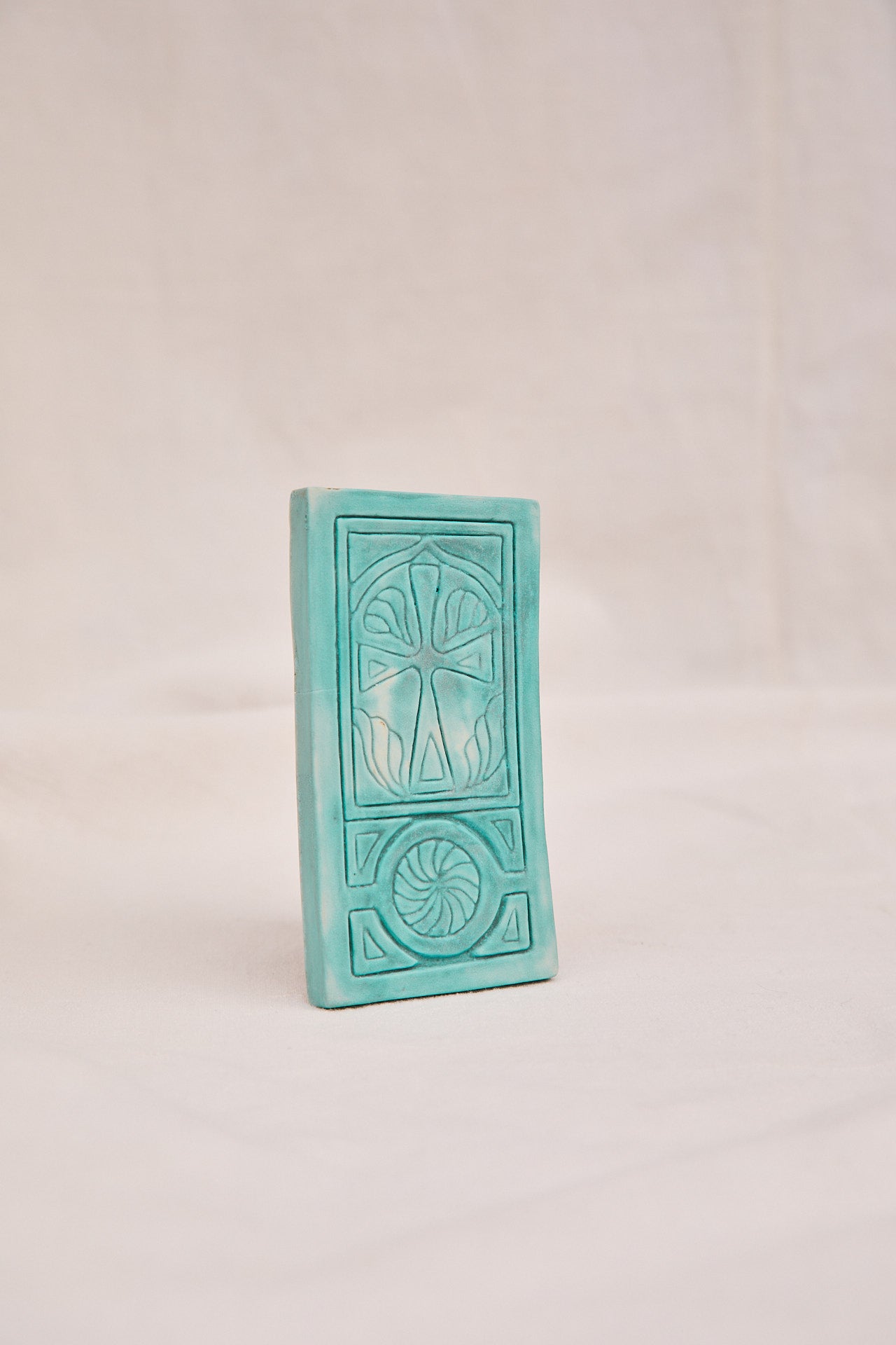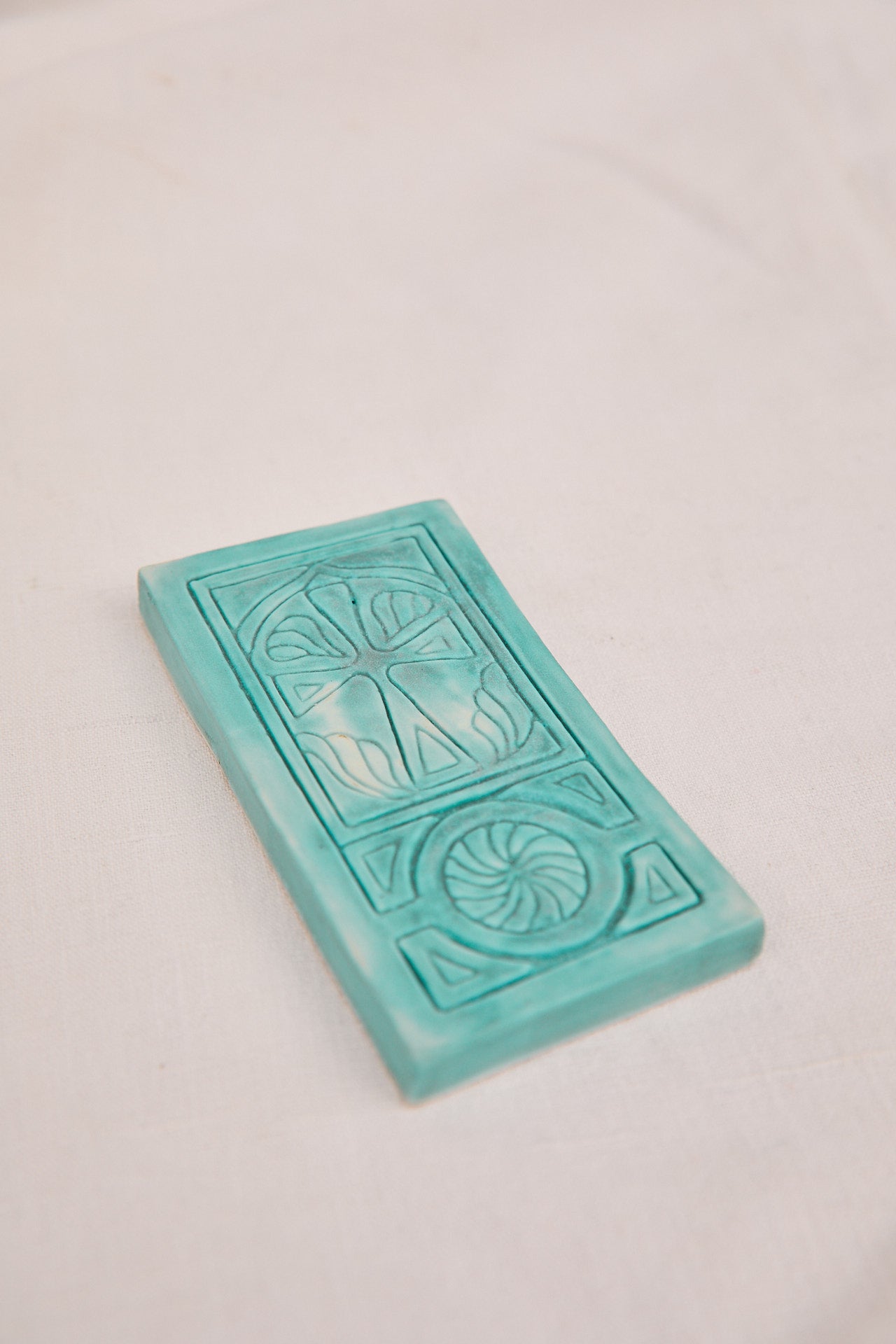 Hand carved ceramic tile, made by Gina A. Sookias, 4.5 x 2.5". This piece can be wall hung or laid flat.